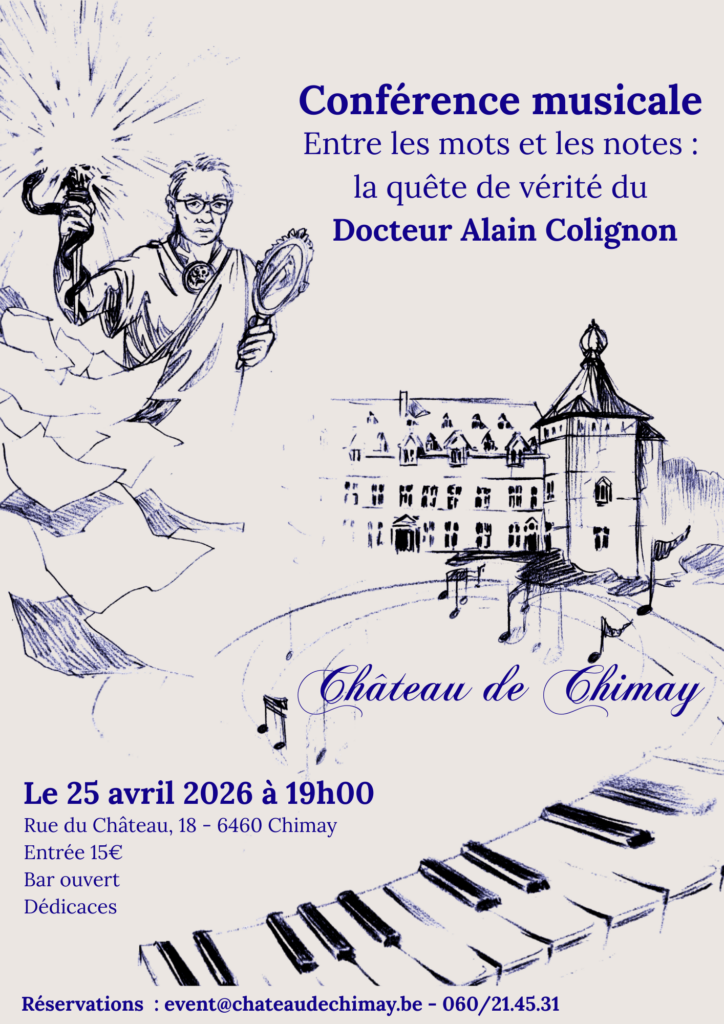 Conférence du Docteur Alain Colignon – Samedi 25 avril 2026 Publié le par Emma TICKETS 15€ / personne Billeterie en ligne INFOS ET RESERVATIONS EMAIL : EVENT@CHATEAUDECHIMAY.BETÉL.: 00 32 60 21 45 31 EN PRATIQUE Parking :Place Léopold, à 5 minutes à piedsGrand’Place, à 2 minutes à piedsAccès au Château : Accédez dans la cour du Château à pieds, par la grille Rue du ChâteauEntrez dans le Château par la porte de droite, en façade du Château, près de la tour carréeHoraires du Concert :Ouverture des portes du Château à 18h30Début du concert à 19h30 précises Fin de la soirée vers 21h30Découvrez nos autres concerts en cliquant ici.