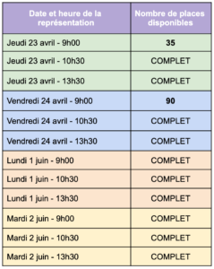 Le nombre de places par représentation étant limité, nous vous invitons à réserver votre créneau sans tarder.